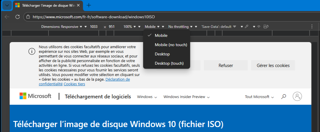 Bonjour KRISTOBAL :) Pour le point 1, oui, exactement. Pour le point 2 : Quand on visite un site web, le navigateur envoie systématiquement au serveur quelques informations sur l'ordinateur du client, qu'on appelle le habituellement "user-agent". Il contient typiquement des données qui étaient, historiquement, particulièrement utiles pour permettre au site d'adapter le contenu de la page servie au client, par exemple, selon les fonctionnalités prises en charge ou non d'après la famille et la version du navigateur, ou encore en fonction de la résolution de l'écran… et aussi, donc, du système d'exploitation. En s'appuyant sur cela, le site web de Microsoft ne propose le téléchargement du Media Creation Tool, puisque c'est un programme pour Windows, qu'aux clients dont le navigateur indique être lancé depuis Windows. Et dans les autres cas, il propose le téléchargement d'un fichier .iso tout prêt. Pour ce qui est de modifier son user-agent, selon le navigateur, la méthode peut changer, mais prenons l'exemple d'une version basique de Mozilla Firefox : Après avoir chargé la page de téléchargement de Windows 10 sur le site de Microsoft, en appuyant sur "F12", on peut ouvrir les "outils développeur". Par défaut, ils apparaissent ancrés sous forme de bandeau en bas de page. Dans le coin supérieur droit de ce bandeau, on trouve l'icône "Vue adaptative" (qui représente a priori un téléphone superposé devant une tablette). Si on clique ce bouton, un autre bandeau apparaît, cette fois tout en haut de la page. À droite de cet autre bandeau, il y a normalement une roue dentée : cliquer dessus pour ouvrir un sous-menu et, s'il n'y est pas encore coché, cliquer sur "Afficher l'agent utilisateur". Un champ intitulé "UA" apparaît dans le bandeau du haut, avec en grisé "Agent utilisateur personnalisé", et un bouton juste à sa droite permettant d'ouvrir une liste déroulante. Il doit suffire, dans cette dernière liste déroulante, de sélectionner "Firefox for Android", puis de recharger la page (avec "F5"), pour que la page de téléchargement propose non plus le Media Creation Tool, mais le choix d'une image .ISO2 points
