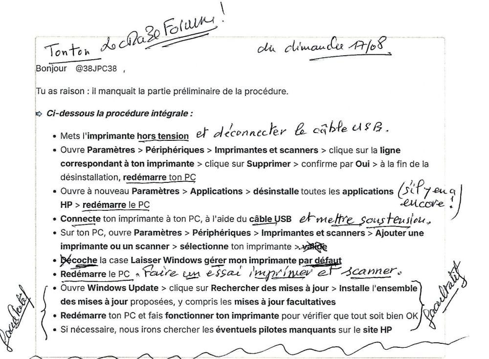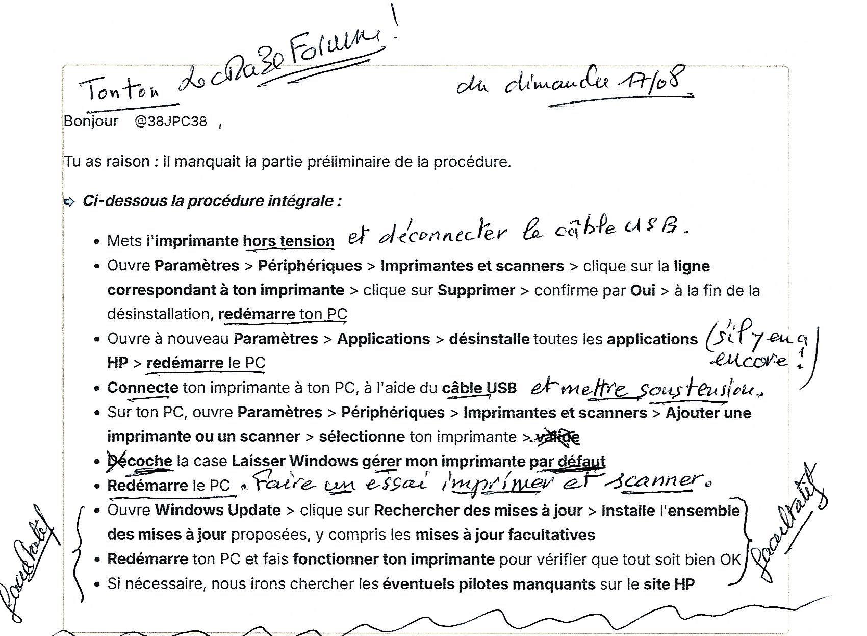 ce 08.01.2026 :Bonjour : suite à une panne de réseau ... et donc panne de WIFI ... et donc mon imprimante HP ne répondait plus ... ... TONTON m'avait édité une manip pour passer mon imprimante en USB au lieu de WIFI. Ce que je viens de faire et ce qui a réussi . Je joins ce doc. avec quelques précisions personnelles. Et encore merci à TONTON. JPC381 point