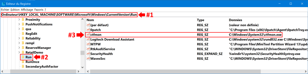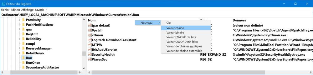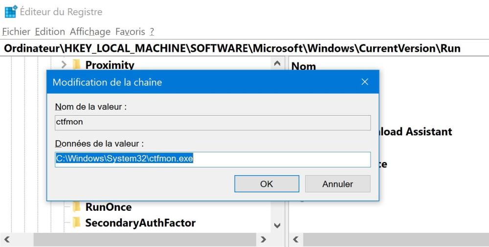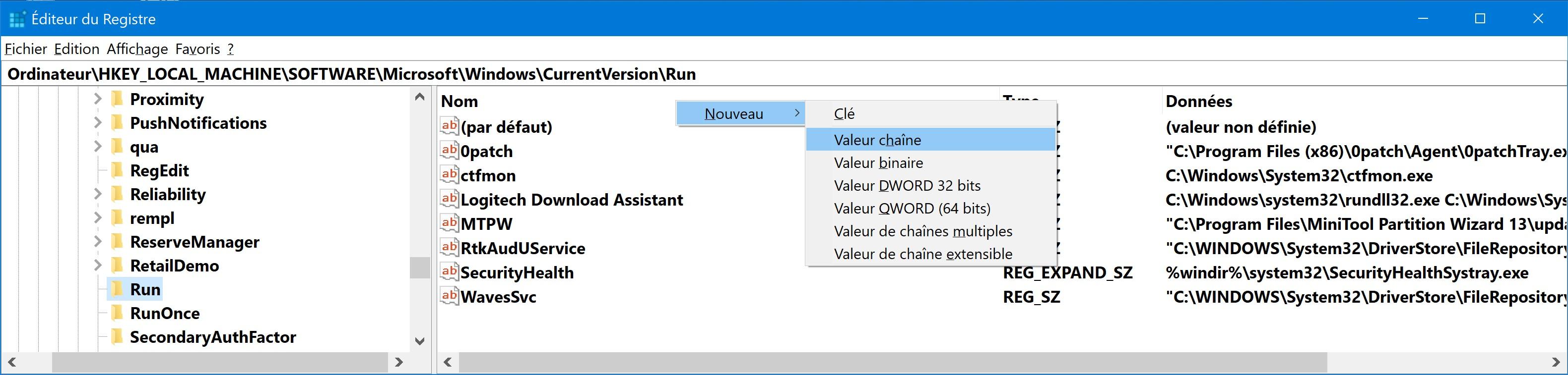 Salut @MACHEPROT, Si vous me le permettez ? C'est un souci que certains utilisateurs de Windows 10 ont également connu, un clavier inactif au démarrage. Qui peut se corriger en créant une Valeur dans le Registre. Avant tout, tu crées un point de restauration Clic-droit sur Démarrer, ensuite sur Exécuter, et dans la fenêtre, tu tapes regedit, et tu presses Enter, si tu as une invite, tu l'acceptes, et le Registre va s'ouvrir. Tu suis le chemin suivant : HKEY_LOCAL_MACHINE => SOFTWARE => Microsoft => Windows => CurrentVersion => Run. Tu cliques sur Run (voir ci-dessous #1 & #2). Dans la section de droite, tu fais un clic-droit, et tu cliques sur Nouveau, et puis tu cliques sur Valeur chaîne (voir ci-dessous). Ensuite, dans la nouvelle fenêtre, tu tapes dans la case Nom de la valeur : ctfmon, et dans la case Données de la valeur, tu entre ceci : C:\Windows\System32\ctfmon.exe (voir ci-dessous), et tu valides en cliquant sur OK. Tu refermes le Registre, et tu redémarres ton ordinateur. Ce ctfmon.exe est ce qui active ton clavier au démarrage. Tiens-nous informé A+1 point