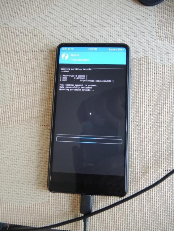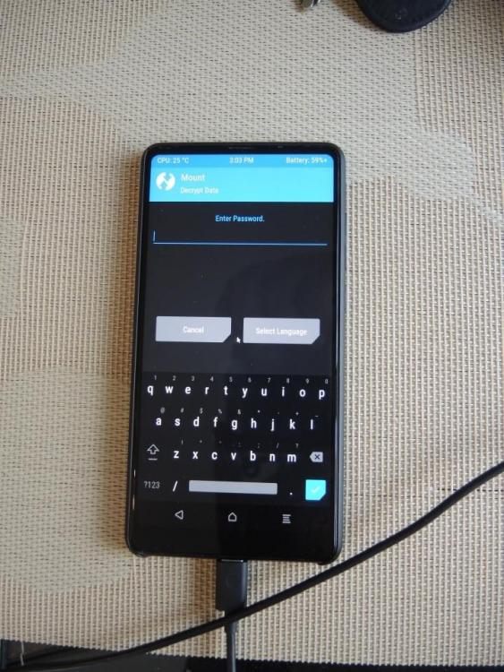 Les données ont l'air d'être chiffrées. TWRP ne te demande pas un mot de passe pour déchiffrer les données ? Comme ceci : (source : http://en.miui.com/thread-1579833-1-1.html) D'après le lien ci-dessus, il s'agit du même mot de passe que celui pour déverrouiller le téléphone. Si tu n'en as pas, redémarre ton téléphone normalement (clique sur Reboot), définis un mot de passe de déverrouillage à 4 chiffres dans Android puis redémarre ton téléphone en mode Recovery. Tu saisis le mot de passe que tu as choisi, TWRP va ensuite déchiffrer les données du téléphone : Tu pourras alors installer la ROM Xiaomi.eu