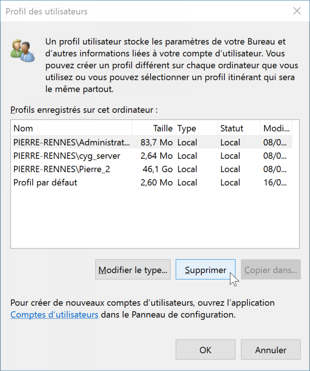 10. Salut @loveofsandy, On va essayer de supprimer le profil de l'utilisateur que tu as supprimé : Appuies sur les touches Windows + R et saisis "sysdm.cpl" Ouvre l'onglet "Paramètres système avancés" Dans la zone "Profil des utilisateurs", clique sur le bouton "Paramètres" Sélectionne le profil de l'utilisateur concerné puis clique sur le bouton "Supprimer" Relance la procédure de rétrogradation vers Windows 8.1. Tiens nous au courant !