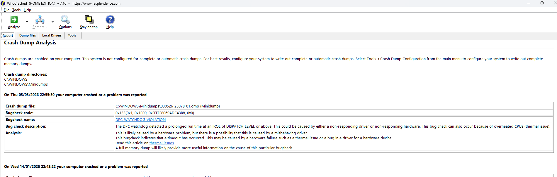 Bonsoir, Je suis récemment entrain de regarder une émission d'info et tout d'un coup mon écran ce bloque et je l'ai redémarré et ça me le refais plus mais ça me l'a encore fais aujourd'hui Je sais pas comment réglé ce problème Hormis ce petit blocage Le laptop est en très bonne santé Voici un userdiag : https://userdiag.com/id/IQXSlMsju9 Dans l'observateur d'evenement j'ai sa Mais quand ça me bloque ça me fais pas d'écran bleu ou noir Et je suis obligé de l'arrêter avec le bouton power