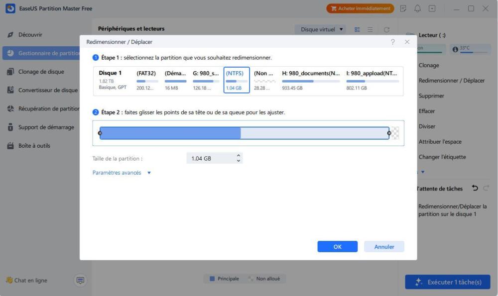 Bonjour. Si calisto06 me le permet, télécharge le programme Easus Partition Master ( https://www.easeus.com/partition-manager/ ) Même dans la version gratuite, les partitions sont redimensionnables et déplaçable sous forme graphique. C'est extrêmement simple à faire. Tu réduis ta partition de données, tu exécute la tâche, tu déplaces la partition de récupération pour la coller à la fin de la partition de données et dans le même temps, tu l'agrandis avec la place libérée à droite (avec les curseurs de chaque côté des partitions) et tu exécute les tâches.