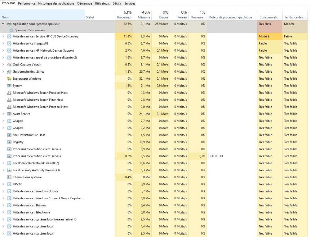 2. Merci pour cette précision. Le problème n'apparait pas lorsque le PC est branché. Je vais donc songer à remplacer la batterie. Avez-vous des sites de vente à me conseiller ? Comment être sûr d'acheter la bonne référence ? Faut-il acheter la même batterie avec les mêmes caractéristiques ou existe-t-il des modèles plus fiables ou avec une autonomie plus importante ? Je joins tout de même une copie d'écran de de mes processus (triés par consommation) : Je m'interroge sur "Application sous-système spouleur"... Merci d'avance pour vos réponses.