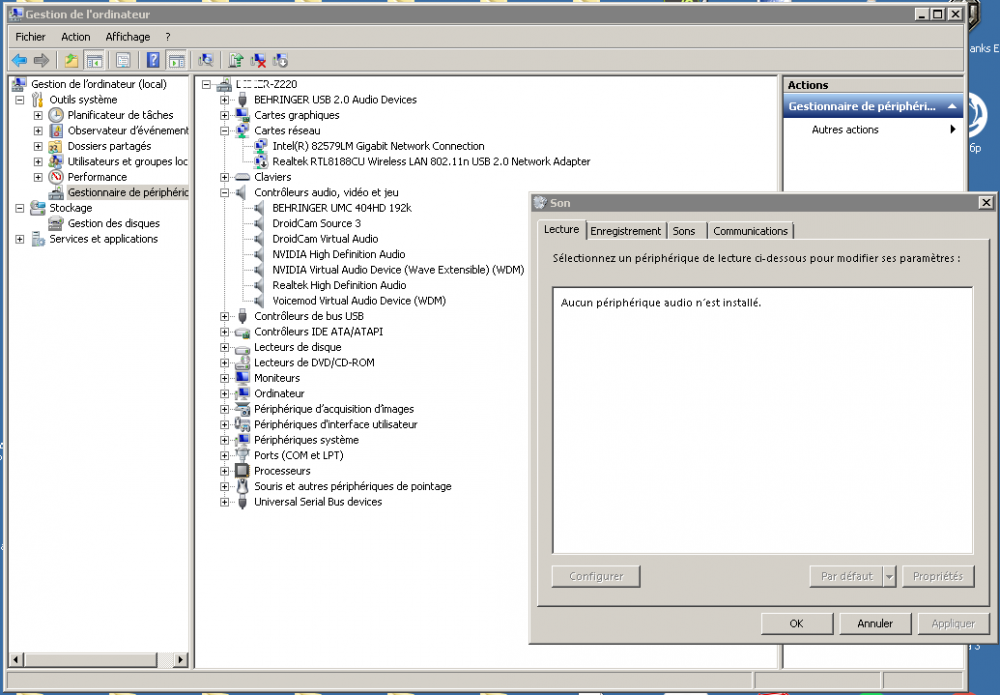 Entre autre actuellement, les pilotes sont bien installés (pas de souci de ce côté) mais sous "Son" dans "Panneau de configuration\Matériel et audio" on a "Aucun périphérique audio n'est installé" dans les onglets "Lecture" ET "Enregistrement"... (de plus une croix rouge apparaît sur le logo de la barre des tâches)