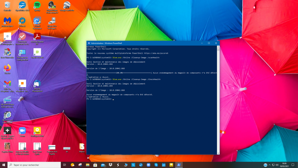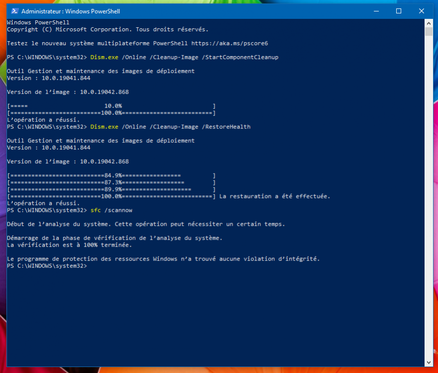 20. Désolé pour le temps mis à vous répondre mais la tentative de sauvegarde a mis plus de 3h45 pour s'effectuer....C'est mon dossier photos qui a un peu sabordé l'espace- temps. Comme l'indiquent les captures Powershell et SFC /Scannow il n'y a pas ou plus de violation d'intégrité mais malheureusement la sauvegarde est restée bloquée à 97% au cours de la création d'une image système pour finalement annoncer son échec ! Avant de quitter cet agréable entretien (pour moi) j'ai quelques questions à vous poser. -1- Comme désormais je vais utiliser AOMEI est-il possible de remettre au propre mon écran ''Sauvegarder ou Restaurer des Fichiers'' sans avoir à supporter les recommandations et autres peintures rouges des bandeaux m'informant des échecs précédents ? (Désolé mais j'aime que le pont de mon bateau soit ''au propre'' comme disent les marins.) -2- L'image système créée juste avant le constat de cette impossibilité de ''sauvegarde'' est elle toujours exploitable ? -3- Est-ce que je peux également en déduire que les sauvegardes et autres outils ''fabriqués'' par AOMEI seront clean et opérationnels ? -4- Enfin une info pour Toto61, la manip alt+imprécran n'a pas fonctionné pour moi ou alors la capture se trouve dans un autre dossier que celui utilisé habituellement. Merci pour ces dernières précisions.