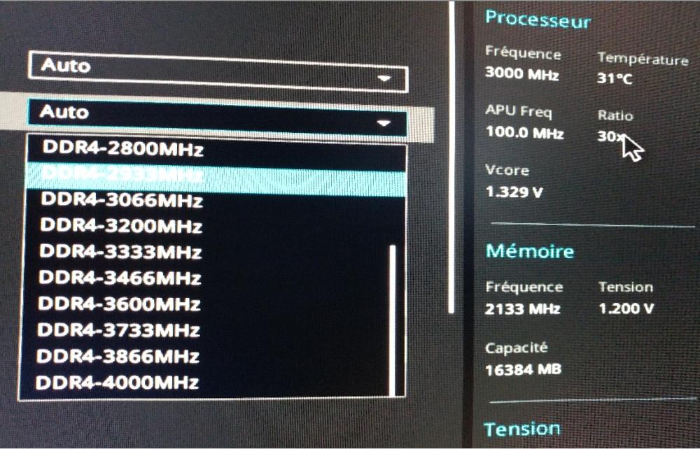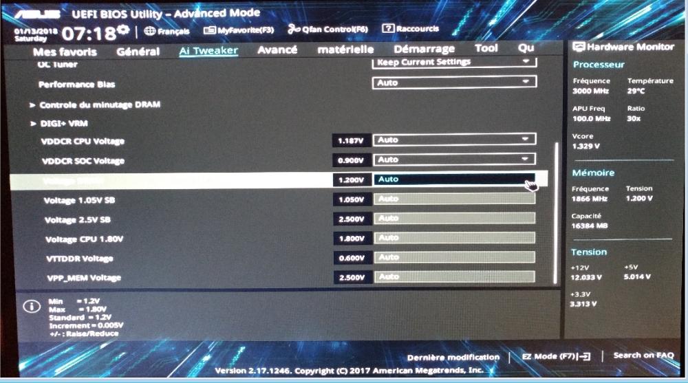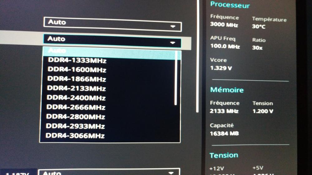 16. Bon dimanche !! En effet @S@T ... Si j'en crois ce qui est écris au Bios la fréquence minimal est 1333 (max 4000) et si je suis bien au bon endroit pour le voltage il est déjà a 1.2v... regarde: Est-ce que je devrais réduire encore la fréquence ?