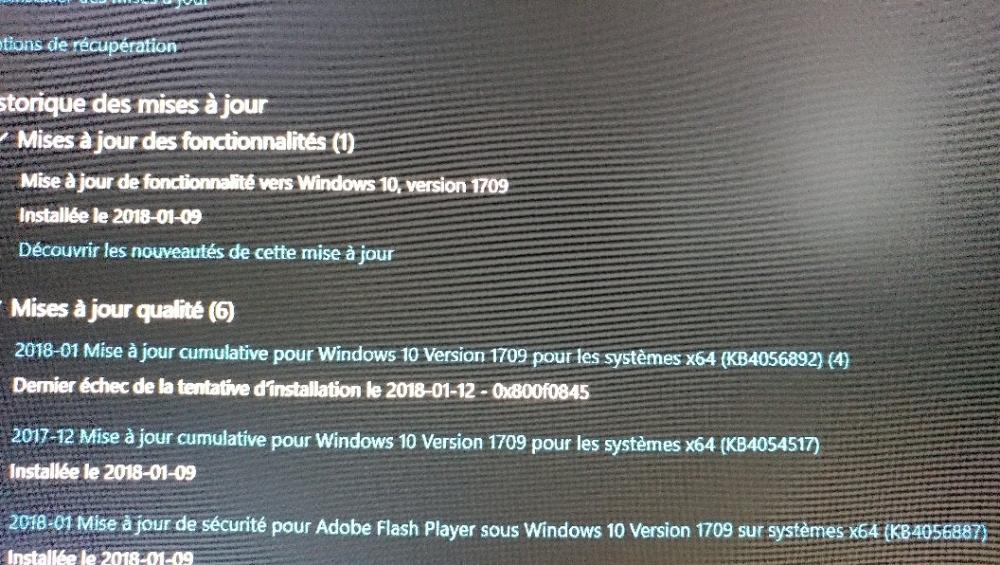 23. @Firebird Pour la KB4056892, j'ai souvent des messages qui me dit qu'une mise a jour ne se fait pas ou est en attente.. (une fois sur 2 c'est juste au démarrage, les autres fois c'est dans le volet de notification à gauche) .. mais j'ai pu noté avant que le pc me fasse un beau BSOD, le code de l'erreur: 0x800F0845, c'est tout ce que j'ai. Les screens que j'ai fait ne sont pas bon, sauf 1... @S@T ... en fait @Delta me donne la marche a suivre pour ouvrir l'Observateur d'évènenement et il n'y a rien de plus d'écrit que sur le screens plus haut... J'ai chercher un fichier (genre de log) sur ce qui cause les BSOD mais je ne trouve pas, mais peut-être qu'il n'y a pas de log aussi.. loll Pas de rousse de si bonne heure Quand je cliquais sur le bouton pour rechercher le "part item" je ne voyais que 5 "sortes" de ram, alors que juste en bas j'avais le bouton NEXT... et 79 pages de ram ! La mienne est à la page 50.. J'ai ouvert un compte sur le site de Corsair et créer un Ticket pour un RMA ou j'aimerais mieux trouver une autre solution (les miracles ça existe non ?) ...
