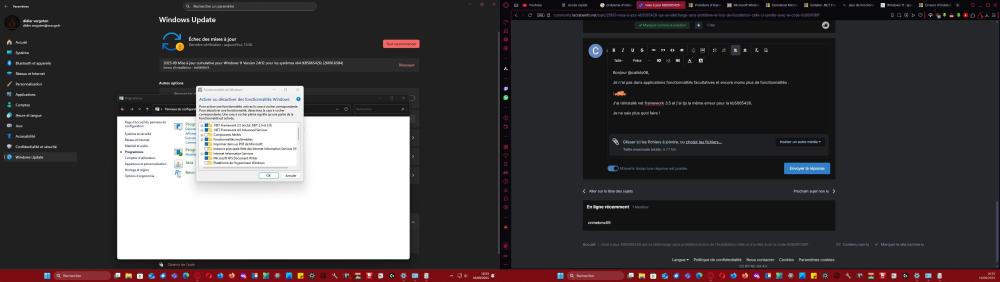 Bonjour , J'ai essayé d'installer la mise à jour KB5064081 qui se télécharge sans problème et lors de l'installation qui arrive à 100% , celle-ci s'arrête avec le code 0X800F081F . J'ai fait SFC sans problème , arrêt des services Net stop cryptSvc Net stop bits Net Stop appidsvc Ren C:\Windows\SoftwareDistribution SoftwareDistribution.old Ren C:\Windows\System32\catroot2 catroot2.old Net Start bits Net Start wuauserv Net Start appidsvc Net Start cryptsvc Redémarrage de mon pc et relance mise à jour rien n'y fait , c'est pour cela que j'ai besoin de votre aide ;-) Cette mise à jour est elle obligatoire ! Merci d'avance .