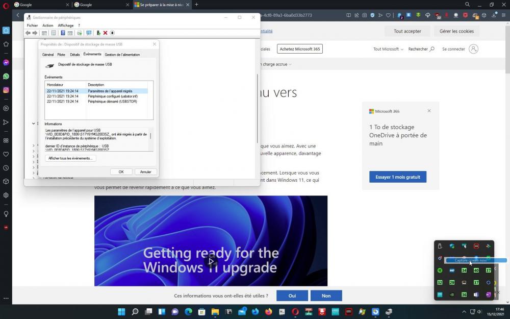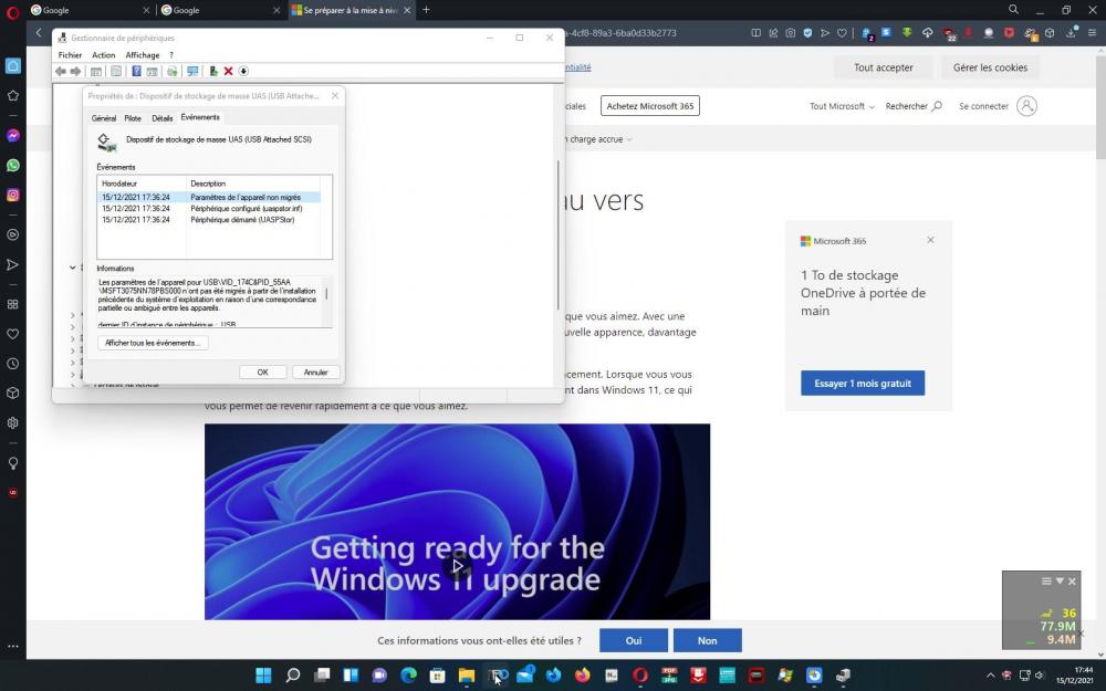 17. Bonsoir, J'ai installé windows 11 familliale 64 bits sur mon w10 d'origine le 22 novembre 2021 et c'est la première fois que je me sers de mes disques connectés en USB sur mon PC . Quand j'arrete mon pc , tout se passe très bien ( je n'ai pas arreté mes disques en usb) , quand je redémarre les disques ne sont pas connectés comme cela se passer avec W10. Je vais donc dans la gestion des périphériques et je suis obligé de faire ub rafraichissement de la configuration pour qu'ils réappaissent . Dans les évenements du dispositifs de stockage de masse UAS ( USB attached SCSI ) je me retrouve avec appareil non migrés . Ci-joint image du panneau de configuration . Y a t'il quelque chose à faire pour ce problème que je n'avez pas sous W10. Merci d'avance et bonne soirée.