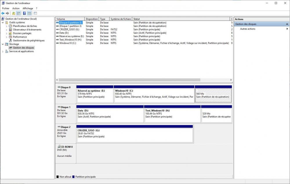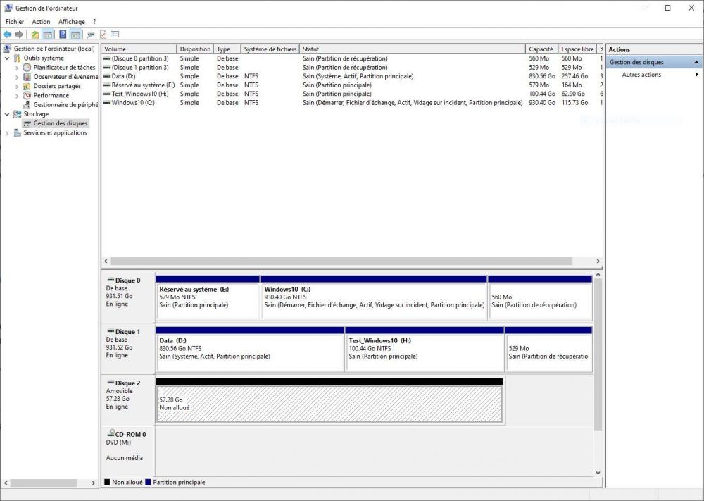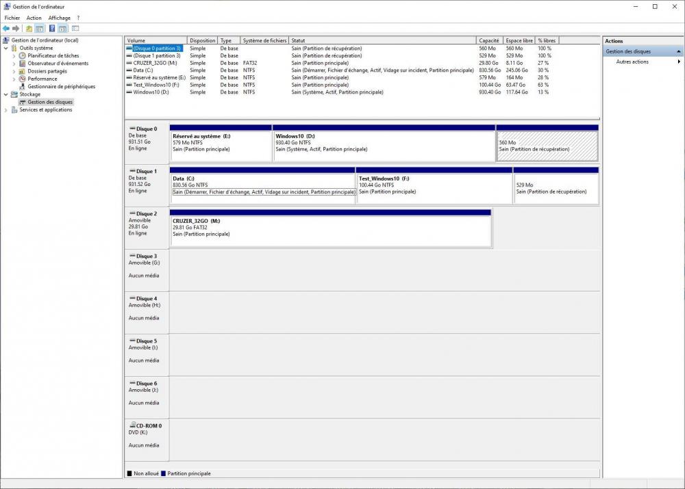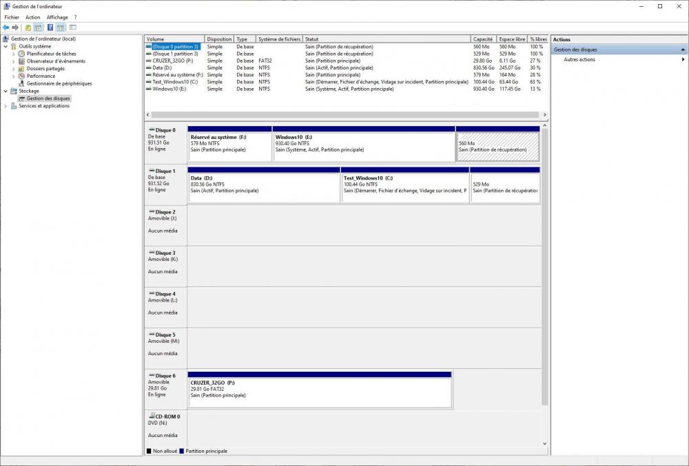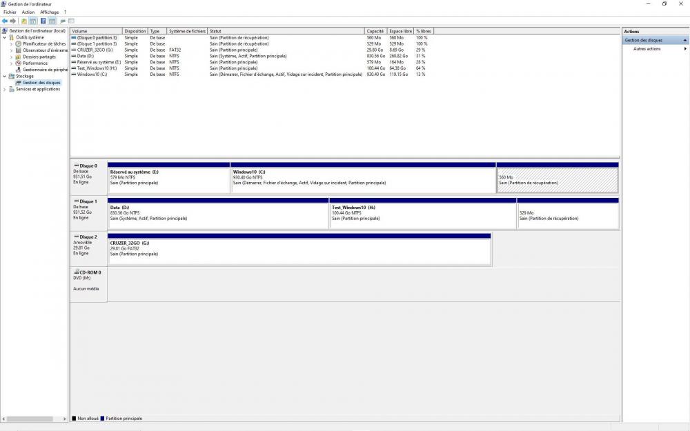 Bonjour @zelandonii et merci pour tes commentaires ! J'ai pu avancer aujourd'hui et j'ai fini par trouver (tout seul) comment booter sur une clé USB : Il faut d'abord que la clé soit branchée lorsque tu accèdes au BIOS. Ensuite dans la séquence de démarrage, il faut ouvrir le Groupe Disques Durs et là, Oh miracle ! , la clé apparait parmi les disques (...). Il m'a suffit alors de la mettre en première position et de redémarrer. Pas de problèmes avec les écrans de Ventoy ni ceux de GParted (le tuto que tu m'as indiqué est très clair). Une fois la partition Data supprimée, j'ai quitté GParted et je me suis mis dans Windows dans Easy Partition Master (en fait après coup j'ai pensé que j'aurais pu/dû tout faire sous GParted (ce sera pour la prochaine fois). J'ai créé une partition en utilisant toute la place disponible, je l'ai définie en NTFS et je l'ai appelé Data. L'étape suivante a consisté à recopier toutes les données sauvegardées de la partition Data, sauf ce qui concernait Windows, les répertoires Programmes et Users où je n'avais rien d'intéressant. J'ai supprimé l'entrée "Windows 10_New" du menu de démarrage d'EasyBCD et j'ai testé les deux Boots : RAS. J'ai aussi testé mes applications, pas de surprises, sauf sur certains logiciels de traitement d'image ou ils avaient perdu les indexations (probablement elles étaient liées à une info de la partition supprimée). Pas grave je relancerai les indexations. Alors tu vas me dire "tout est donc réglé !...", presque, parce que j'ai encore quelques petits problèmes et points à clarifier (Je vais encore un peu abuser de ton temps) : 1) J'ai remarqué que dans Gestion de l'ordinateur, Disques, ma partition Data n'a pas la même couleur... En regardant de plus près, j'ai vu que j'avais créé une partition "logique" alors que j'avais une partition "principale". Penses-tu qu'il faut que je la transforme? Si oui, comment me conseilles-tu de procéder? Est-ce que ça se fait sans effacer les données. (je t'attache une capture d'écran). 2) Le point qui m'embête le plus c'est l'histoire de ces 4 "lecteurs USB" supplémentaires qui se sont crées et qui n'apparaissent que du côté Test_Windows. Sans aucun périphérique USB de connectées, ils apparaissent dès la fin du Boot. On voit aussi dans Périphériques et imprimantes une icône USB2.0-CRW. Je peux la supprimer mais comme je te le disais elle réapparait au Boot suivant. Là aussi j'ai fait les captures d'écran qui permettent de comparer le Boot côté Windows 10 et côté Test_Windows_10. Ce sont des captures avec exactement le même matériel de connecté, je relance juste le Boot. Il n'y a pas non plus d'anomalie dans le Gestionnaire de périphériques (voir capture). Dans le pire des cas, je ferai une réinstallation de Windows (en conservant mes fichiers et programmes) côté Test_Windows 10, mais je voudrais éviter d'en arriver là. Les points suivants sont moins importants et tu peux peut-être juste me donner une piste : 3) Comment t’y prendrais-tu (quel logiciel ?) pour faire un multiboot « propre » ? 4) As-tu une idée de ce qui m'empêchait de construire la clé avec Ventoy sur le côté Windows 10 ? Tant que je possède un second Windows, je peux toujours m'en sortir, mais c'est mieux de comprendre ce qui coince. 5) Enfin et ça c'est plus facile et ce sera la dernière pour ce soir, quel logiciel me conseilles-tu pour Booter et remettre d'équerre le Master Boot et la BCD en cas de souci? Est-ce que GParted permet cela? Merci ! Guy.