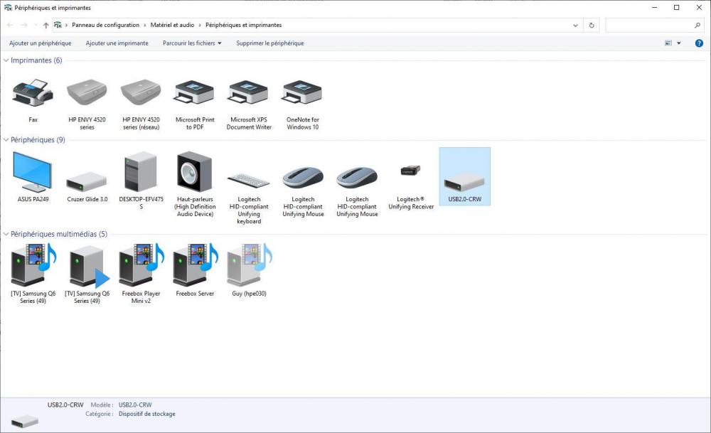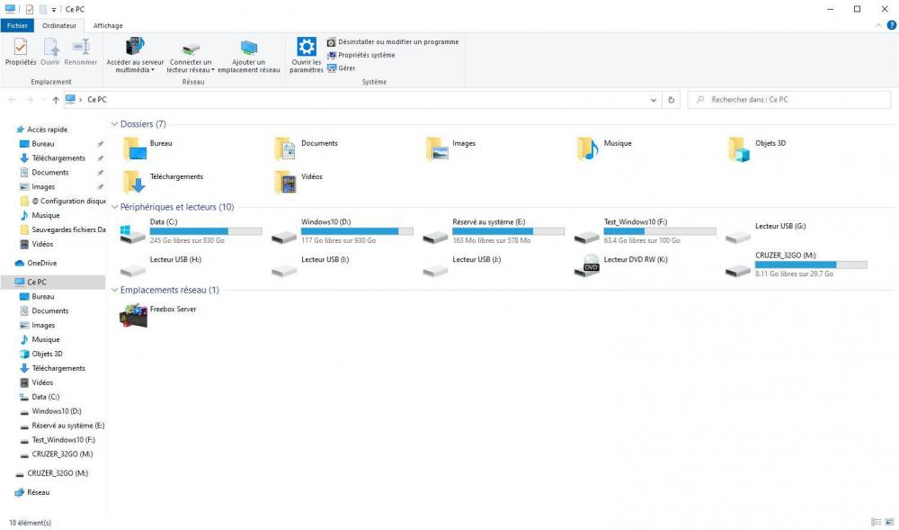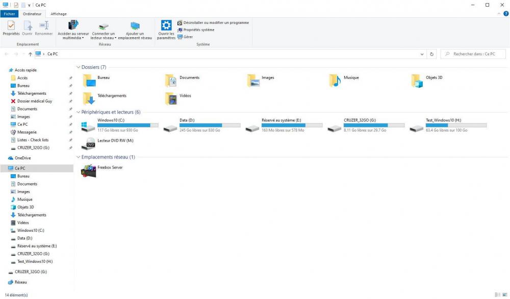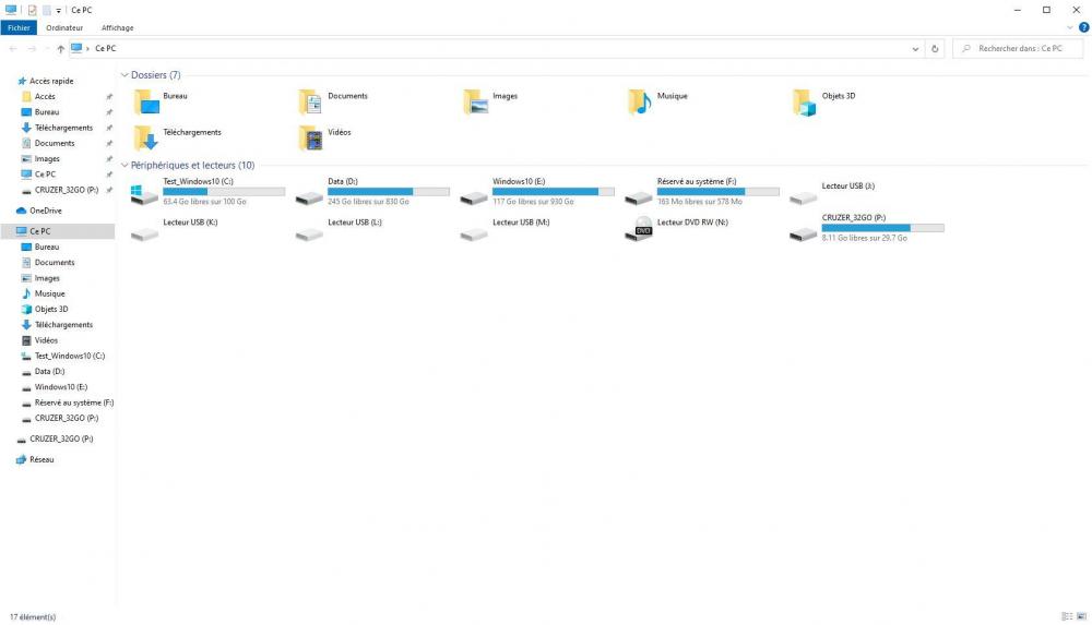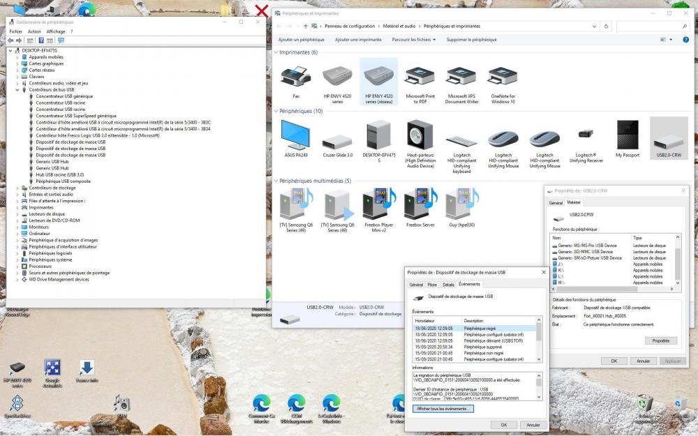 Bonsoir @zelandonii, voici le résultat des nombreux essais faits aujourd'hui: J'ai rencontré tout un tas de problèmes, non directement liées à ces essais, et ça a un peu "pollué" les tests, mais je vais essayer de te faire un résumé. La construction de la clé étant bloquée, j'ai regardé comment avancer sur les autres opérations en attendant : - en premier j'ai voulu vérifier que je pouvais bien Booter sur une clé USB. Mon PC est un Ordinateur de bureau HP Pavilion Elite HPE-130fr et il a un BIOS. L'accès au BIOS se fait par la touche F10, et là, dans les options de démarrage, je n'ai que - Groupe Disques Durs, - Groupe CD-DVD, - Groupe Floppy et - Groupe Réseau. Pas grand chose à voir avec l'USB. J'ai fait des essais en mettant - Groupe Floppy en premier (j'ai un autre PC où ça fonctionne, mais pas celui là). Je suis sûr de l'avoir déjà fait sur ce PC mais pas moyen de retrouver comment... J'ai écrit au support HP (aux US maintenant, il semble que le support en France n'existe plus) pour avoir l'info, mais je n'ai pas encore de réponse. Par contre, surprise, le fait d'avoir fait des essais a perturbé mes fichiers de démarrage et le Boot menu d'EasyBCD a disparu... Il est remplacé par le menu noir et blanc "Gestionnaire de démarrage Windows". Bon, j'ai quand même mes trois entrées, et elles donnent accès aux trois Windows, mais ce n'est pas très sain. J'ai désinstallé EasyBCD sur le Windows du disque 0 je l'ai réinstallé : pareil. J'ai réinitialisé EasyBCD et j'ai recréé mes trois entrées, mais j'ai eu le même résultat. Finalement j'ai restauré une sauvegarde de la configuration d'EasyBCD (c'est une option du programme) et là j'ai retrouvé le bon menu et toutes les entrées fonctionnent. Je me répète, mais ce n'est pas très sain tout ça. Entre temps j'ai vu ton post et effectivement, si j'avais fait la manip d'installation de Ventoy sur d'autres ports et plusieurs clés (en NTFS puis en exFAT) je n'avais pas testé l'installation à partir d'un autre de mes Windows. Sitôt dit sitôt fait, et là, (bonne) surprise, ça a marché du premier coup! (Bravo pour l'idée !). J'ai donc pu copier aussitôt GParted sur cette clef. Maintenant il ne me reste plus qu'à trouver comment booter sur une clé USB... J'ai eu aussi une autre surprise : Une fois que la manip de création de clé a fonctionné, je me suis rendu compte que sur Test_Windows 10 et Windows 10_New, à la fin de chaque Boot, je me retrouve dans le poste de travail avec 4 lecteurs USB en plus… (une image valant mieux que 1000 mots...) je t'attache des copies d'écrans pour des Boots sur ces deux Windows. [Je mets en premier le Poste de travail du Windows principal, puis Test_Windows, puis Windows_New. Je mets ensuite dans le même ordre les captures de Gestion de l'ordinateur, Disques et enfin une capture de l'écran Périphérique et imprimantes où un périphérique "USB2.0-CRW" est apparu sur Test_Windows 10 et Windows 10_New qui correspond à ces quatre "nouveau disques"]. Pour la petite histoire, Windows à l'arrivée sur le bureau fait une notification pour dire qu'un périphérique qui vient d'être connecté fonctionne mal. Pour la seconde petite histoire, je peux supprimer le périphérique USB2.0-CRW, mais il réapparait au boot suivant... Comme je te le disais, je n'ai pas ce problème sur le Windows d'origine. Je patauge allègrement dans tout ça sans rien y comprendre. Dernier point, en fait, en relisant mes notes, je me suis rendu compte que le Windows du disque 0 est effectivement très chargé mais n'est pas si vieux parce que j'ai fait une Clean Install de Windows 10 1903 en mai 2019... Donc le problème à résoudre est juste "comment supprimer proprement le Windows 10_New" et ton approche de formater la partition Data reste valide (désolé pour la confusion). J'espère que ce n'est pas trop confus. Merci encore. Guy