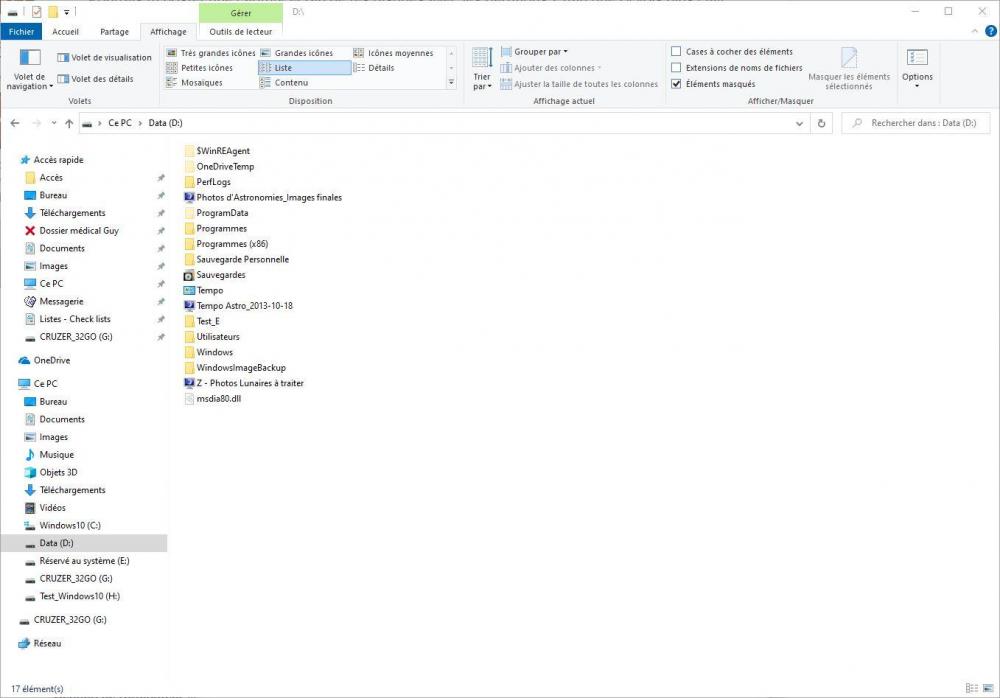 Bonjour @zelandonii et merci pour ta réponse. J'attache une capture d'écran de mes disques (prise lors d'un boot sur mon premier Windows) ainsi qu'une capture du contenu de la partition Data (en affichant les fichiers et dossiers cachés). Pour info mon Windows d'origine apparait dans cette capture en tant que partition "Windows 10 (C:)" sur le disque 0. Le second Windows apparait en tant que "Test_Windows 10 (H:)" sur le disque 1. Et le dernier (celui que je veux supprimer) est dans la partition "Data (D:)" du disque 1 Je ne pensais pas non plus que Windows puisse s'installer comme ça, en vrac , au milieu des données... N'hésites pas à me dire si tu as besoin d'autres éclaircissement. Guy.