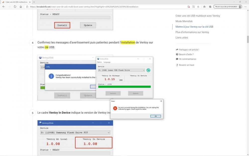 Bonjour @zelandonii, Merci pour le temps que tu me consacres et pour les liens et tutos vers GParted et Ventoy. Je m'y suis mis ce matin, et j'ai pris le temps de regarder le tutoriel de GParted mais dans la vraie vie (ma vie informatique en tout cas) les choses se passent rarement comme dans les tutos : Je coince sur l'installation de Ventoy sur ma clé USB. « An error occurrred during the installation. You can replug the USB and try again. Checklog.txt for detail » (voir Capture et fichier log). Ma clé était une 8Go, vide et formatée en NTFS. Comme il le propose je l'ai retirée et j'ai recommencé : rebelotte. J'ai changé de clé, (j'avais une 64Go sous la main) elle aussi vide et en NTFS et j'ai eu le même résultat. Lorsque je l'ai retirée et remise elle n'était plus reconnue par Windows, je suis allé dans Gestion de l'ordinateur, disques, là elle y était mais sans lettre, j'ai lancé l'utilitaire pour la définir et ce coup ci je l'ai formatées en exFAT. Je te tiens au courant. Le formatage est long (chaque fois je me pose la question entre "formatage rapide" et "lent", et par sécurité je choisi "lent", mais lent c'est long avec ces capacités...) A+ Guy log.txt