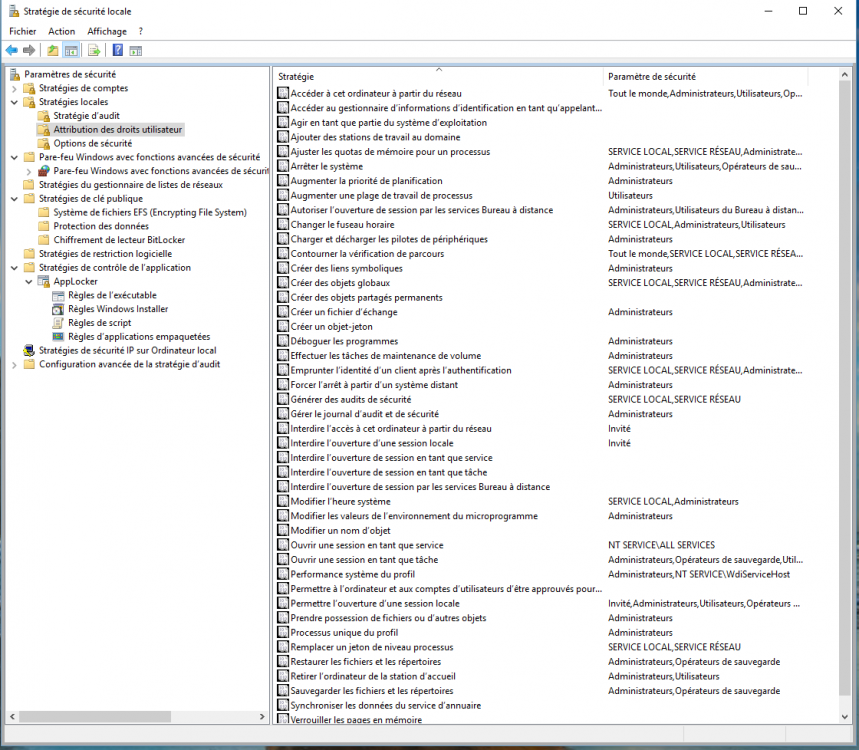 Salut Roger1, Pour le grand administrateur, simplement pour les soucis du moment si ça permet de régler quelque détail facilement pourquoi se priver mais avec modération bien sur. Je sais que toucher à la base peut être à double sens, j'en ai déjà fait l’expérience mais je ne connais pas quelqu'un qui a testé sans connaître de crache (c'est comme ça qu'on se forme lol) cependant c'est une des bases que je touche le moins(pour ça que j'ai demandé si la méthode précité plus haut était bonne et valait le coup). Pour la solution que tu ma trouvé ben....... ils ont du y penser aussi lol car à priori ce n'est pas tout a fait la même chose, j'ai bien outils d'administration-stratégie de sécurité local mais après il n'y a plus la partie option de sécurité donc j'ai un peu fouillé et trouvé à priori ce qui se rapporte le plus prés, stratégies locales-Attribution des droits d'utilisateur mais après ben la liste est longue j'ai trouvé celui-la aussi je pencherai pour celui-ci qui semble correspondre à ce que tu parle mais bon la je connais pas du tout cette partie, entre Windows 7 et Windows 10 1511 U1 sur laquelle je suis ils ont totalement changé la configuration de ce que l'on connaissait avant. Si tu peux me renseigner un peu plus ça m'arrangerai surtout que ça permettrai de revenir en arrière une fois que j'ai réglé mon problème. En attendant je vais continuer a voir avec Edge (pas installé IE pour le moment si je peux éviter). Merci pour ta(es) réponse(s).