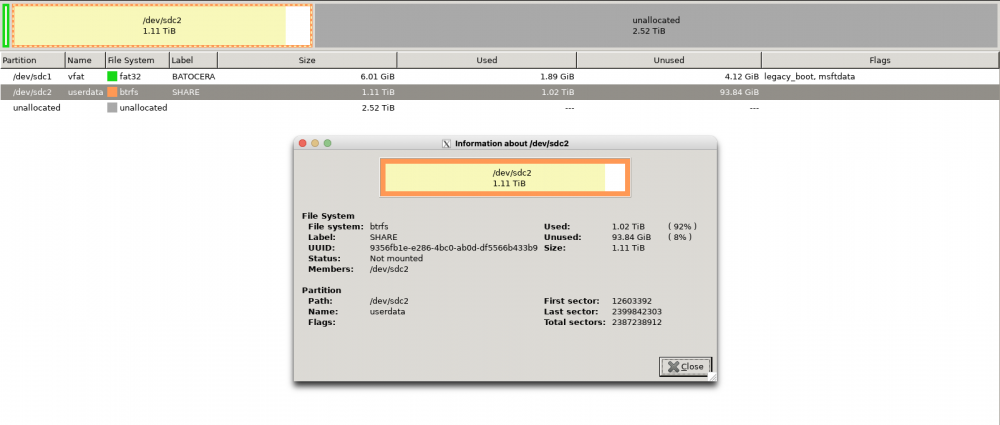 Si je recommence tout avec un support plus simple pour les tests (parceque 1,5 to ca fait long ) - Prenons une clef usb (sdc) de 32GO venant d'une iso ubuntu . Objectif : faire une sauvegarde img la plus petite possible. C'est a dire avec les deux partitions totalisant 2,6 GO environ au lieu de se retrouver avec une image de 32 GO : La derniere partition s'arrete a 53003231 secteurs. faisons l'image (/media/Sharedftp/testdisk.img) : J'obtiens bel et bien un img correct (petit) que j'ai monte en /dev/loop0 pour etre certain J'ai donc fait restaurer l'image sur la clef usb.. Elle est pareille ET pleinement opérationnelle . Juste une petite remarque dans gparted les partitions n'apparaissent pas comme il le faudrait mais c'etait aussi le cas avec le fichier iso ubuntu d'origine ... Donc au final c'est pas si effrayant. Je verrai sur le vrai clonage de disque qui est ok sur gparted. Il fallait prêter attention dans le cas du clonage du gros disque le disque ne commence pas au secteur 0 ... mais a 2048 donc le compte ne peut etre bon sans le specifier je pense.... mais je suis plus determine que n'importe quel roi :) ET voila @Firebird tu n'avais pas la reponse concrete j'avais promis de tenir au courant.... Plus qu'a faire le test sur le disque de base mais la je pense que ca ira... MERCI MESSIEURS vous avez pris le temps surtout @Tulburite