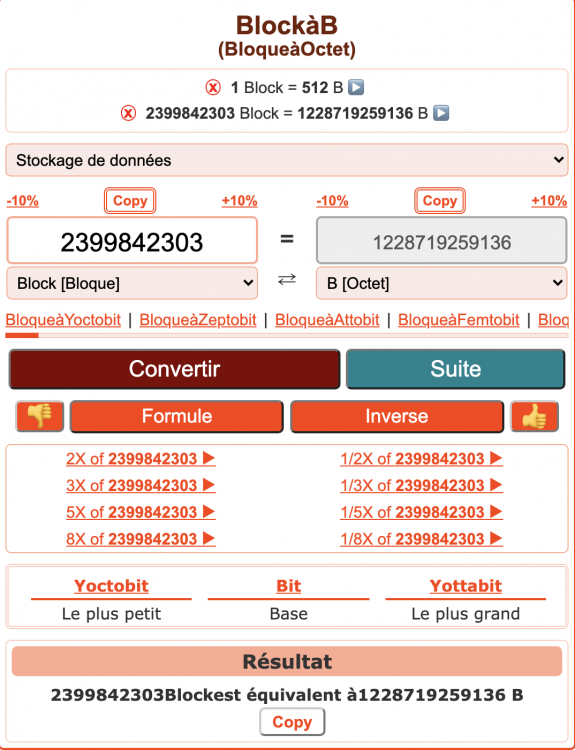 j'ai regardé le manuel de dd (pas possible de faire plus concret).. Pour cette operation il faudrait juste le nombre de blocs et connaitre les sources/destinations . D'ailleurs c'est aussi sur le tuto plus haut. Il y a donc le necessaire ici : Disk model: Basic Units: sectors of 1 * 512 = 512 bytes Sector size (logical/physical): 512 bytes / 4096 bytes I/O size (minimum/optimal): 4096 bytes / 4096 bytes Disklabel type: gpt Disk identifier: 1B7B87E7-CFD3-439D-BEB7-0EFA5B466323 Device Start End Sectors Size Type /dev/sdb1 2048 12603391 12601344 6G Microsoft basic data /dev/sdb2 12603392 2399842303 2387238912 1.1T Linux filesystem tu as l'air de bien maitrise le sujet donc tu taperais quoi ?? Ce serait aussi le meilleur moyen de comprendre ou j'ai fait une erreur. Je veux etre plus dans le concret que dans le "mystic". Pour clonezilla j'ai aussi bien compris que c'est sympa mais je veux vraiment comprendre cette "option de dd" comme ce fut le cas lorsque je voulais juste savoir faire de simple copies .. avec la commande.