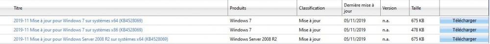 Bonjour à tous @marianne30 Je suppose que tu as suivi la procédure décrite dans ce tuto du crabe Normalement la dernière mise à jour pour Windows 7 la KB4534310 devait être disponible à partir du 14 Janvier, si Windows Update ne te l'a pas encore proposée tu peux la télécharger et l'installer via le catalogue Microsoft attention de bien choisir la ligne correspondant à l'architecture de ton système 64 X64 ou 32 bits X86 Il se pourrait ( conditionnel donc sans certitudes ) que tu puisses vérifier la disponibilité des prochaines mises à jour via ce catalogue. Et donc si ces mises à jour du catalogue te sont proposées via Windows Update c'est que la procédure décrite dans le tuto du crabe est opérationnelle pour ton OS Kristobal -