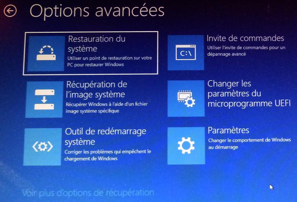 Bonjour à tous @KasharelSupposition : Si à partir des options avancées vous ne pouvez pas accéder au paramétrage du microprogramme, c'est que votre BIOS est un BIOS d'ancienne génération . Pour en avoir la certitude il vous faudrait démarrer votre système et appuyer sur la touche (souvent F2 ) permettant d'accéder au BIOS ( Ecran avec logo constructeur) avant le lancement du système. Regardez ce tuto du crabe Question : Votre processeur est-il compatible 64 bits ? Une remarque : Plutôt que de publier votre message dans un fil déjà ouvert, et même si votre problème est similaire à celui de l'objet de ce fil, il aurait été plus judicieux d'ouvrir un nouveau sujet en faisant référence éventuellement à celui ouvert par @Tavernier Cordialement Kristobal