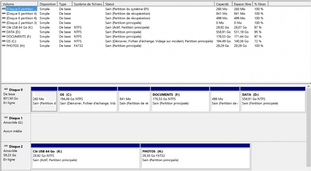 20. Bonsoir @Laulu C'est plus clair, mais vous me permettrez un petit reproche, à savoir que votre premier message prêtait à confusion notamment l'emploi du mot mobile, le terme ordinateur portable aurait été plus adapté. Donc le problème vient de la partition recovery sur D, je suppose que cette partition constructeur doit permettre de restaurer le système à l'état "usine". Étonnant la présence de ces deux fichiers dans cette partition, comment ont-ils pu arriver là ? Il semblerait que vous ayez accès au contenu de cette partition puisque vous pouvez visualiser son contenu et donc les deux fichiers problématiques, encore étonnant s'agissant d'une partition recovery qui est bien souvent cachée. Pourriez vous dans votre prochain message joindre une copie écran de l'organisation de vos partitions dans une fenêtre de la gestion des disques, ça ressemble à çà : Pouvez vous précisez la version de Windows ainsi que la marque et le modèle de votre ordinateur. Bonne soirée Kristobal