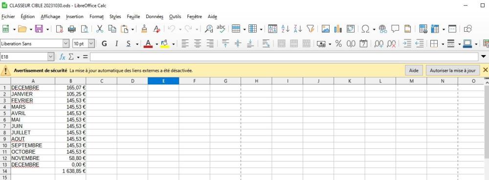 @Aygues31 J'ai créé dans un même répertoire un fichier source et un fichier cible avec dans les cellules du fichier cible des formules du genre =$'JANVIER 2023'.I4 pour les lier aux cellules du fichier source Je modifie une donnée du fichier source J'ouvre le fichier cible voir ci dessous Je clique sur le bouton Autoriser la mise à jour la case du fichier cible est bien modifiée Voir le Menu Outils/Options/Libre Office Cal /Général Rubrique Actualiser les liens au chargement Cocher la case Toujours Voir aussi cette page Kristobal -