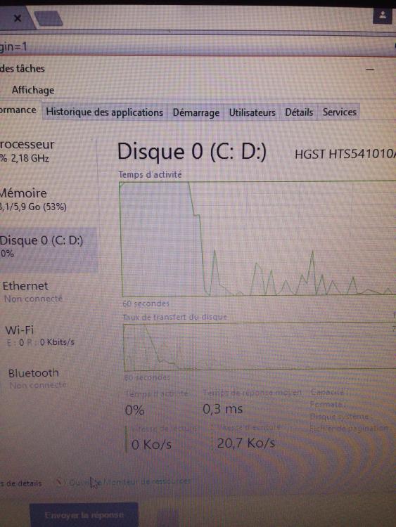 7. Bonjour à tous, Je sollicite la communauté pour m'aider à résoudre un problème apparue il y a 2 semaines. En effet, suite à des mises à jour automatiques (anormalement longues) de windows, j'observe dans le gestionnaire de tâches que mon disque utilise parfois entre 95 et 100% de ses capacités. C'est très étonnant, surtout quand je n'ai qu'une page internet d'ouverte et rien d'autre! (avant ces maj, je pouvais faire tourner des jeux sur mon ordi et maintenant une simple video youtube peut faire crash). Je crois que c'est le surrégime du disque qui entraîne un crash de mon ordinateur (un bruit atroce et fixation de l'image). Je vous remercie par avance. En cette période de rentré j'ai besoin de mon outil de travail. Je vous serais donc très reconnaissant pour toutes aides apportées