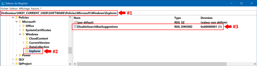 Salut @hellothere101, Si vous me permettez ? Si tu es sous Windows 10, clic-droit dans la Barre des tâches => Rechercher => et puis dans la partie encerclée tu as deux options, décoches celle qui est en lien avec la recherche, et redémarres ton ordinateur. Si ça ne fonctionne pas, fais un copier/coller du code ci-dessous dans le Bloc-notes, et puis tu nommes le fichier avec .reg comme extension de fichier, et tu sélectionnes Tous les fichiers (*.*), et tu crées une clé pour ensuite la fusionner. Avant d'effectuer la fusion, crées un point de restauration. Une fois fusionnée, redémarres ton ordinateur. Windows Registry Editor Version 5.00 [HKEY_CURRENT_USER\SOFTWARE\Policies\Microsoft\Windows\Explorer] "DisableSearchBoxSuggestions"=dword:00000001 Ou si tu préfères, tu peux aller créer une Valeur DWord dans le Registre : Tiens nous au courant. A+ -
