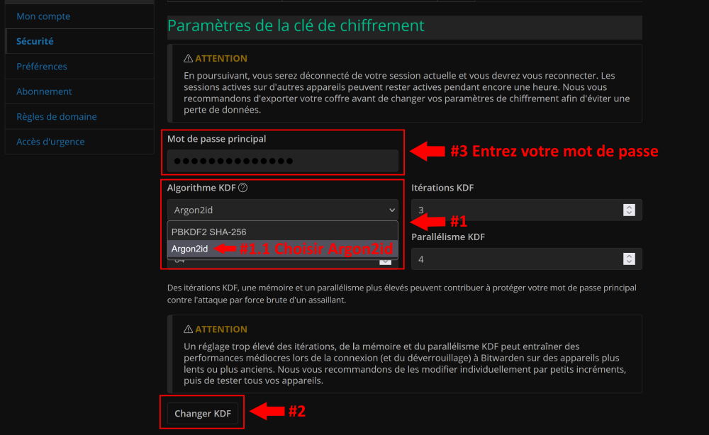 Salut à tous ! Vous pouvez activer l'algorithme “Argon2id”, quels sont les avantages d'Argon2 par rapport à PBKDF2 ?. En un mot, Argon2 offre une sécurité accrue par rapport à PBKDF2, car le contenu crypté prendra non seulement plus de temps aux pirates pour craquer votre mot de passe, mais nécessitera également une puissance de calcul importante. Bitwarden utilise Argon2id, qui est un hybride entre Argon2d et Argon2i. Cet algorithme est non seulement plus solide contre les attaques par canal latéral, mais aussi plus résistant aux attaques par GPU. Au préalable, exportez votre coffre, au cas où il y aurait un problème... perso, tout a très bien fonctionné ! Vous devez être sous la version 2023.2 de Bitwarden. 1. Rendez vous à cette adresse : https://vault.bitwarden.com/#/login et accédez à votre compte. 2. Accédez à la section “Sécurité”. Cliquez sur le menu déroulant (#1). Sélectionnez “Argon2id” (#1.1), vous pouvez les paramètres par défauts, qui sont suffisants. Cliquez sur “Changer KDF” (#2), votre mot de passe maître vous sera demandé. Renseignez votre mot de passe maître (#3), et c'est tout ! Vous vous déconnectez. Une fois ce changement d'algorithme effectué, vous allez devoir reconnecter l'application de Bureau, ainsi que les extensions “Bitwarden” de vos navigateurs. Il y a plusieurs jours de cela, tous les navigateurs sous Chrome avaient mis à jour l’extension (vers la version 2023.2), alors que Firefox, vient à peine de le faire 🙄!! En tout cas, maintenant c'est fait !! Et voilà ! A+-
