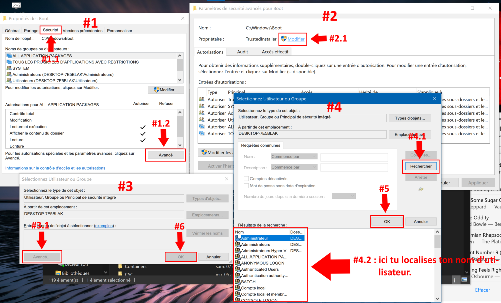 Salut @Eddy713, Excuse-moi, lorsque tu es dans Propriétés, tu sélectionnes l'onglet Sécurité, et tu poursuis avec les instructions mentionnées plus tôt. Tiens nous au courant A+