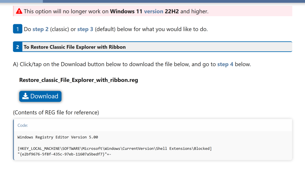 Salut @recha43, Si tu parles de cette méthode par le Registre, elle ne fonctionne plus depuis la version Windows 11 22H2 : Par contre les deux premières méthodes de ce tutoriel (Anglais), pourraient fonctionner ??? Ref. : https://www.elevenforum.com/t/restore-classic-file-explorer-with-ribbon-in-windows-11.620/ A+