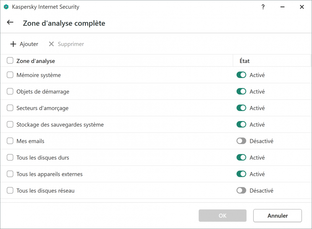 Salut @Sandelta, Si @calisto06 me le permet ??? Étant un utilisateur de “Kaspersky Internet Security”, je peux te confirmer que c'est possible (captures d'écran ci-dessous), via les paramètres d'analyse : J'ai “Kaspersky” d'installé sur mes deux “laptops”, et je n'ai aucun ralentissement ou souci quelconque. A+ -