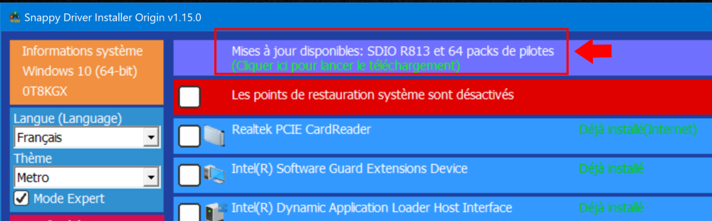 Salut @carine262000, Est-ce que le Medion fonctionne bien ? Si oui, j'attendrais de voir avec la prochaine version de SDIO, et je le laisserais tel quel 🤷🏽♂️? Qu'est-ce qu'il se passe si tu fermes cette fenêtre ? Est-ce que l'application se ferme totalement ? Avant de faire ce qui est ci-dessous (si tu décides d'aller de l'avant ?), je souhaiterais avoir ta réponse. Si tu ressens le besoin impératif de mettre à jour les pilotes, avant de t'exécuter, bouges la fenêtre pour que tu puisses cocher la case pour créer un point de restauration (il est possible que cette fenêtre passe en arrière de celle où tu as cliquer pour créer un point de restauration, si c'est le cas utilises la même fenêtre pour sélectionner tes pilotes, et cliques sur “Installer”), si ce n'est pas le cas, tu peux utiliser cette fenêtre, et cocher les cases de ceux qui sont “Manquant” seulement, et cliquer sur “Seulement ceux nécessaires” Quand même qu'un redémarrage ne soit pas nécessaire la plupart du temps, je te suggérerais d'en effectuer un tout de même. Conserves les lignes de commandes avec ton Bloc-notes, et par expérience, je peux te dire que surtout après une mise à jour Windows, que tu pourras refaire l'analyse de ton système en les utilisant, ou encore à l'occasion lorsque tu en auras le temps, et tu auras très très sûrement des surprises ! Donnes-nous en des nouvelles A+