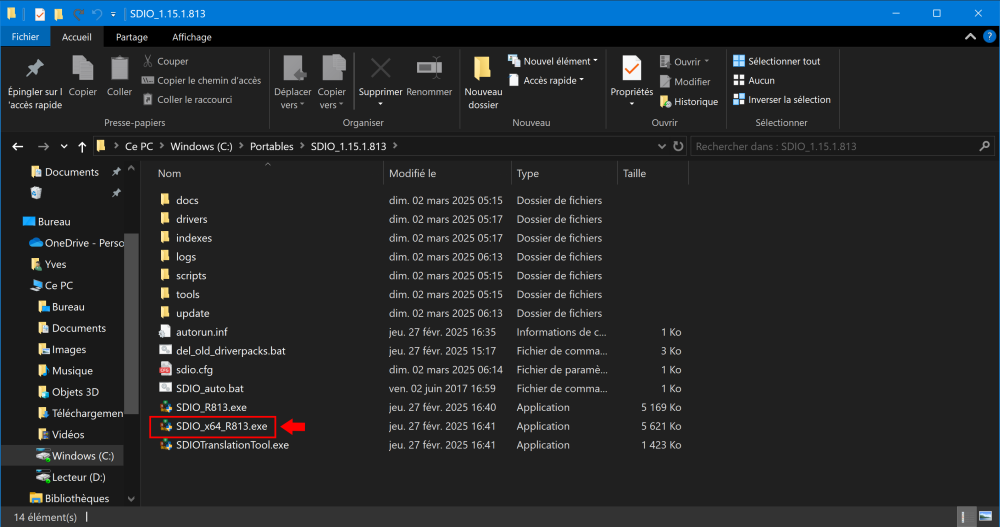 Salut @carine262000, Si tu avais épinglé l'application sur l'écran d'accueil, désépingle la. Coche les cases “Application” et “Index”, ensuite Accepter, et puis OK. Une fois la mise à jour effectué, tu retournes dans ton dossier SDIO pour recréer la tuile sur ton écran d'accueil en sélectionnant la version SDIO_x64_R813.exe , ton système est bien en 64 bits ? Si ce n'est pas le cas tu prends celui qui est juste au-dessus (voir ci-dessous) Si la version que tu avais précédemment est présente dans ton dossier contenant l'application, tu peux les supprimer. L'autre option, serait de supprimer la tuile de l'écran d'accueil, et de supprimer le dossier contenant ta version actuelle. Tu télécharges via ce lien SDIO , tu décompresses l'archive, tu vas dans ton dossier contenant SDIO, et tu recrées la tuile, et puis soit depuis ton .exe ou depuis ta tuile, tu lances en tant qu'administrateur, et tu ne télécharges que les index. C'est cette dernière que je choisirais d'effectuer, de toute façon c'est une application qui est portable 🤷♂️! Tiens nous au courant A+ -