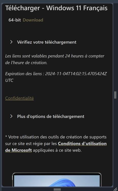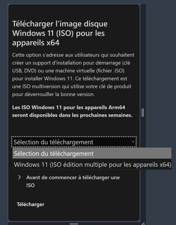 Salut @jeanclaude34, Tu peux télécharger un ISO avec ces petites manipulations. tu ouvres Edge à cette adresse : https://www.microsoft.com/fr-fr/software-download/windows11 Ensuite, une fois sur le site, tu presses F12, et tu as une fenêtre qui va s'ouvrir (voir ci-dessous) : Tu cliques sur la zone encadré en rouge, cela va ouvrir ta console, où tu prends soin de vérifier que l'émulation est bien activé (dans la capture l'émulation est activé), (voir ci-dessous) : Si ça ne l'est pas, tu cliques dessus, et ça va l'activer. Ensuite tu rafraîchis la page (tu peux également fermer la console), et tu procèdes aux sélections (dans mon exemple je n'avais pas fermé la console) Et pour finir tu cliques sur Download (ci-dessous), et tu auras un ISO que tu pourras utiliser pour créer une clé bootable avec Rufus. A+ -