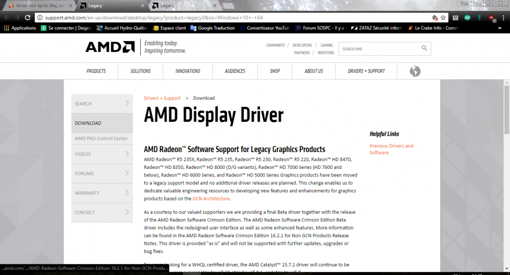 Salut @atopos, Sur le coté droit de la page ATI, il y a un lien « Helpful Links », où tu peux cliquer sur « Previous Drivers and Software » qui va t'amener sur une page qui pourrait contenir ton " Driver " ? Prends le temps de vérifier si c'est le bon " Driver ", avant d'installer quoi que ce soit. Tu n'es pas le seul !!! Tiens nous au courant A+