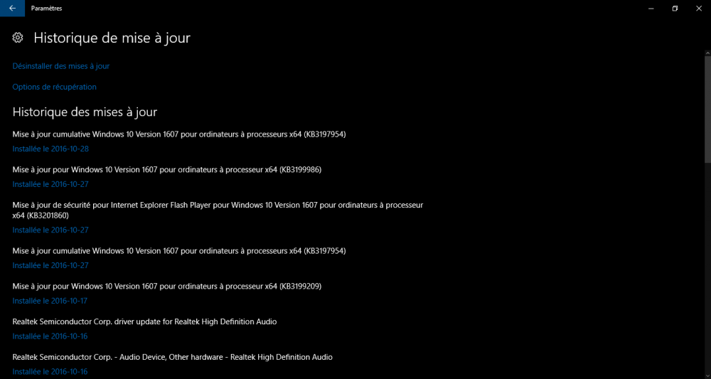 salut Roger, Il doit sûrement parler de ces mises à jour, voir la capture d'écran. Dont l'une d'elle s'est installé deux fois ! Soit le 27 et le 28 !!! Version 1607...Maud#%+** Salut Yoann2b, Voici un lien pour t'indiquer où désactiver le "Démarrage rapide" : ICI Tiens nous au courant A+