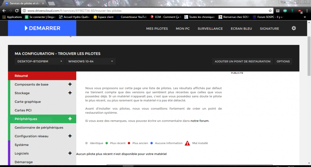 Salut Sharice, Après avoir lancé l'analyse de ta configuration, une fois celle-ci terminé, tu cliques sur "Mes Pilotes" et tu auras un peu plus bas, une liste de pilotes qui peuvent être mis à jour. Si il n'y a rien, c'est que tous les pilotes sont bien à jour. A+