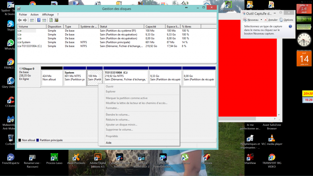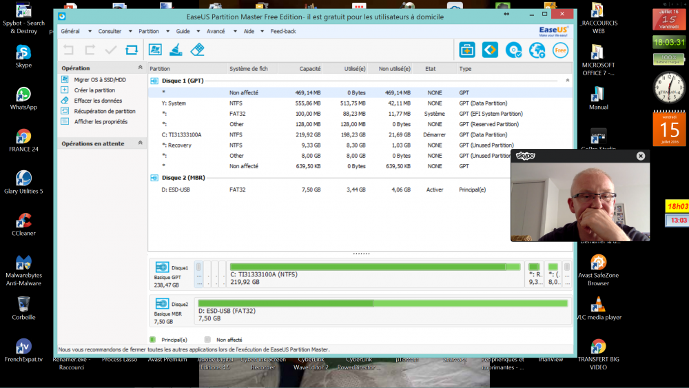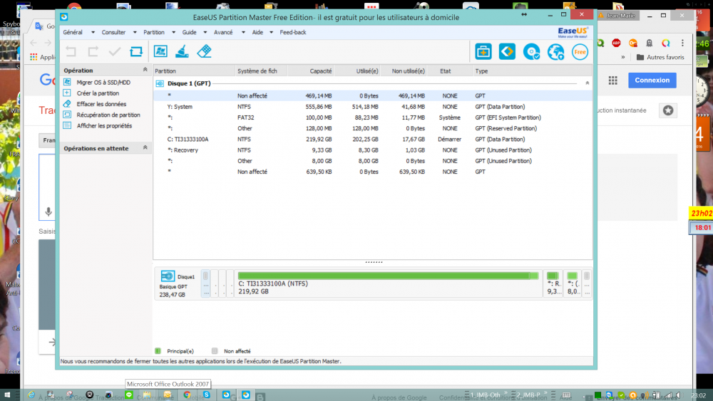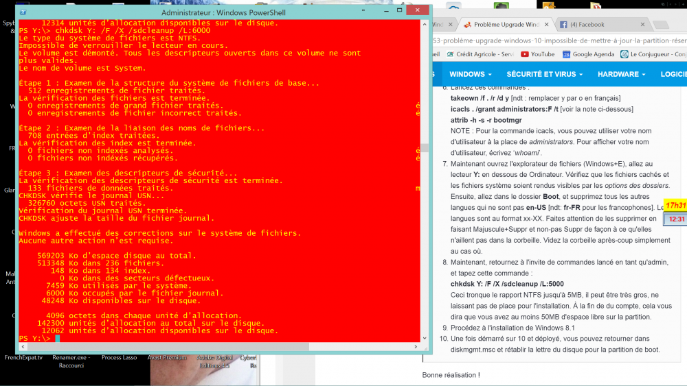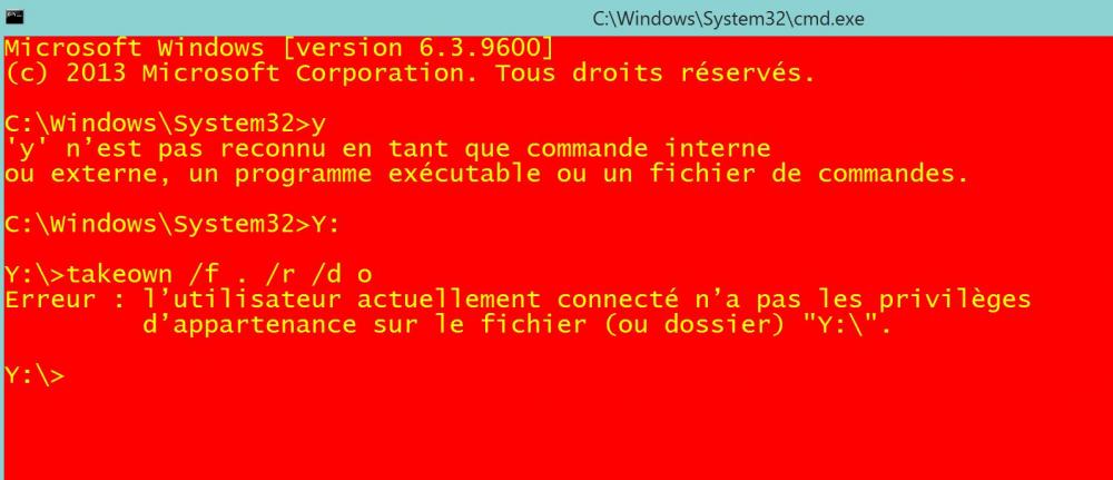 OK j'ai vu, merci. J'ai pu faire toutes les commandes, juste une erreur j'ai remplacé grant administrators par grand administrateurs en français pour que ça passe. J'ai bien vu ensuite mon disque Y et fait la commande chkdsk. Je suis ensuite parti de ma clé USB pour faire l'install et ça se plante encore avec le même message d'impossibilité de modifier la partition systeme... Je ne comprends plus rien. Merci quand même. Chez moi il est plus de 23h, je me couche