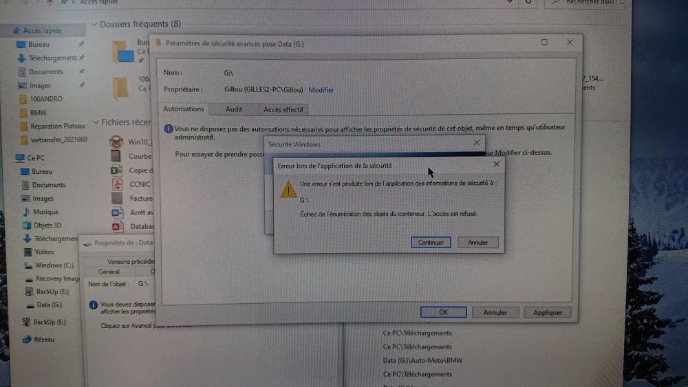 8. Bonjour, suite à la mise à jour 21H1, je n'ai plus d’accès à la partition D (sur le même SSD que C), à la partition G (2ème SSD), à E (carte SD) ni à mes clés USB ou disque externes. Pour tous j'ai un message type "D:\ n'est pas accessible". En allant plus loin, dans les propriétés j'ai "impossible d'afficher le propriétaire actuel". Si j'essaie de me réattribuer la propriété j'ai "une erreur s'est produite lors de l'application des informations de sécurité...échec de l'énumération des objets du conteneur. l'accès est refusé" puis impossible de définir le nouveau propriétaire. Pas plus de réussite avec la commande TakeOwn. Là s'arrête mes compétences. Avant la mise à jour, tout allait bien. Si quelqu'un a une idée, par avance merci
