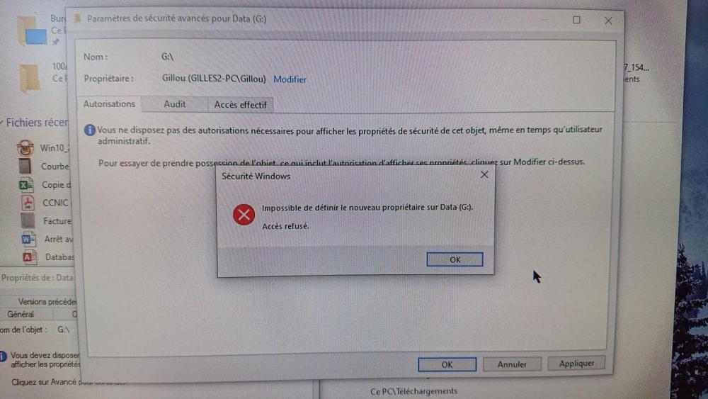 2. J'ai essayé avec un nouveau compte Gillou (administrateur). Je n'ai comme sur le compte LGpro qu'accès à C et je ne peux pas reprendre la propriété du reste, y compris clés ou disque USB externes.