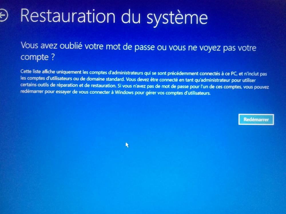 "Cette liste affiche uniquement les comptes des administrateurs qui se sont précédemment connectés à ce PC et n'inclut pas les comptes d'utilisateurs ou de domaine standard. Vous devez être connecté en tant qu'administrateur pour utiliser certains outils de réparation ou de restauration. Si vous n'avez pas de mot de passe pour l'un de ces comptes vous pouvez redémarrer pour essayer de vous connecter à Windows pour gérer vos comptes utilisateur."