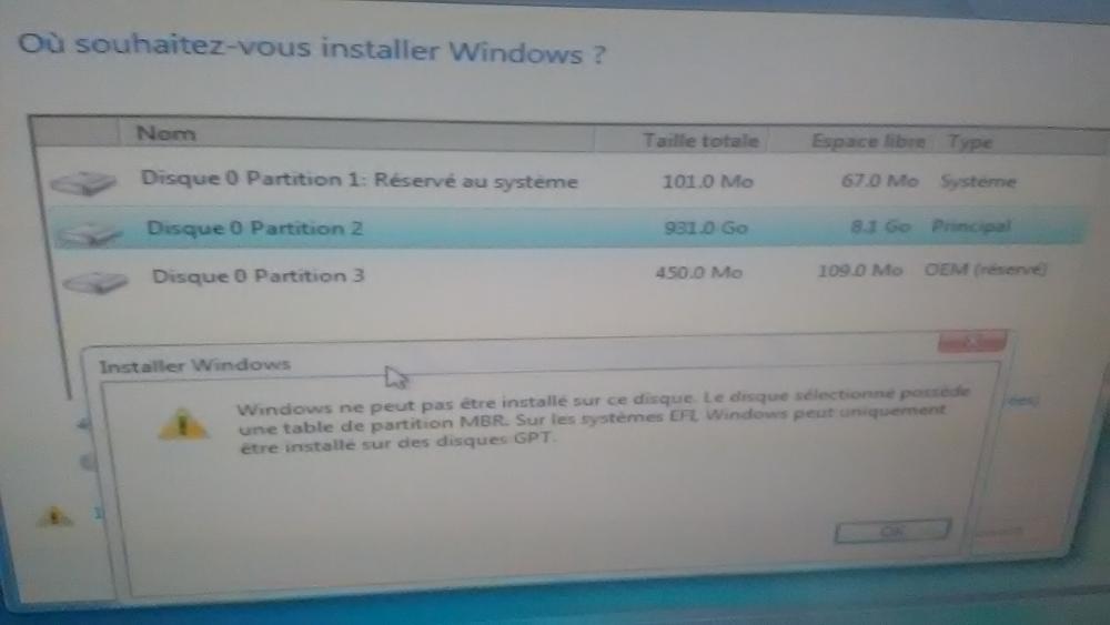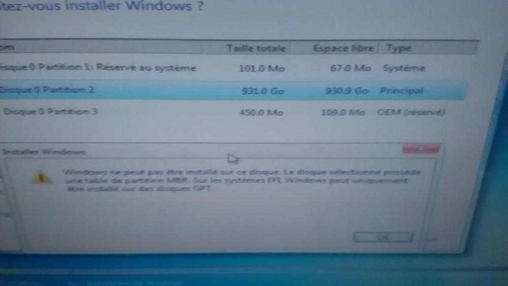 mais vu que je suis pas trop a l'aise avec tout ceci ... je voulais retourner sur windows 7 au lieu du 10 avec mon cd installation win7, sauf il me dit que le disque dur n'est pas en GPT mais en MBR, mais je sais pas quel partition utiliser pour faire le changement vu que j'en ai 3 (1 pour le système , un pour toute mes données et un autre pour OEM ).