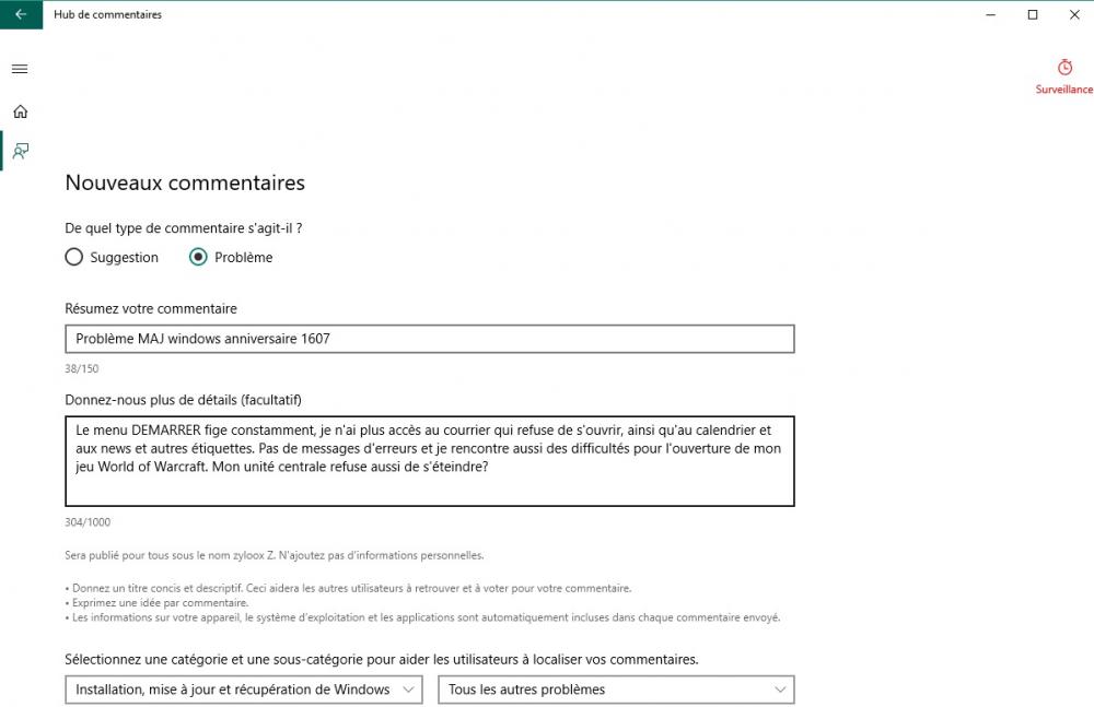 8. Bonjour, Comme certainement d’autres utilisateurs, je rencontre des problèmes depuis la dernière mise à jour Anniversaire Windows 1607. Le menu DÉMARRER se fige en permanence et je rencontre des difficultés pour démarrer World Of Warcraft. Je ne peux plus accéder au courrier et certainement aux autres étiquettes. J’ai essayé les diverses méthodes que vous préconisez, mais mon unité centrale reste sourde à toutes mes sollicitations. Je signale qu’aucune erreur n’a été détecté. Je suis entrain de télécharger l’ISO de Windows 10, mais je ne me fais guère d’espoir. J’avais trouvé un lien sur votre site qui m’a renvoyé sur le site de Microsoft où j’ai pu exposer mon problème et où je bénéficie d’ un suivi de 12h, mais impossible de le retrouver? Pourtant, c’est le seul endroit où j’avais trouvé des commentaires d’autres internautes qui rencontrent le même problème que moi. Mon système d’exploitation est Windows 10 Professionnel système d’exploitation 64bits, Processeur Intel Pentium 3,2 GHz et ma carte vidéo NVIDIA GeForce GTX 750 ti. J'ai depuis ce message essayé sur le compte Administrateur et je rencontre aussi ce même problème du menu DEMARRER qui fige à chaque fois que j'essaye de l'utiliser. Le clic droit sur l’icône Windows fonctionne par contre le COURRIER et LE CALENDRIER ne répondent absolument pas. Je n'ai pas testé cette méthode qui se rapporte à la version précédente où je n'avais jamais eu de soucis, "Méthode 2 : avec un script PowerShell. Cette méthode n’est plus conseillée si vous avez la version 1511 de Windows 10." Il semble que ce problème concerne surtout les versions professionnel 64x car l'internaute qui avait fait son commentaire, avait exactement le même problème que moi avec un équipement quasi similaire. Mais impossible de retrouver cette page!!!! C'est une aide Windows avec un suivi de 12h proposé. J'espère qu'ils m'enverront un lien car j'ai laissé mon adresse mail. Si quelqu'un connait ce site et peut m'indiquer le lien, ce serait vraiment très sympa pour que je puisse prendre connaissance des divers problèmes rencontrés et le cas échéant, des solutions trouvés. Je ne l'ai malheureusement pas conservé car j'ai le suivi de l'historique désactivé sur mon navigateur!!! En attendant de trouver une solution, je vous remercie de l'aide que vous nous avez apporter avec votre site, que je ne connaissais pas avant d'avoir eu ce soucis. Cordialement.