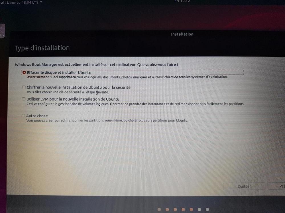 Bonjour, Dans ce tuto sur l'installation en dual-boot il est indiqué, à un moment donné : " Sélectionnez l’option Installer Ubuntu à côté de Windows Boot Manager puis cliquez sur Installer maintenant. " L'ennui, c'est que je n'ai pas cette option sur mon écran...Ca débute par "Effacer le disque et installer ubuntu", et ensuite "chiffrer...", "utiliser LVM"...", "Autre chose" Je précise qu'il s'agit de l'installation d'Ubuntu 18.04 LTS, et que j'ai déjà W10 sur l'ordi. Qu'en pensez-vous ? Je devrais choisir "Autre chose" ?