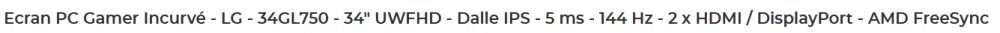 Bonjour, mon écran principal est connecté en HDMI, quant au second que j'avais rajouté (puis débranché), il était branché en DVI-D (Single Link). Pour ce qui est du son, le jack de la barre de son était connecté sur le premier écran (endroit pour écouteurs puisqu'il n'y a pas de hauts parleurs), maintenant, mon écran principal est : Écran incurvé pc Gamer-LG-34GL750-34" UWFHD acheté en 2022. Pour l'autre, un simple écran sans hauts parleurs PHILLIPS 68" avec 2 prises (VGA et DVI-D (Single Link) acheté en 2005. Voilà pour le descriptif !