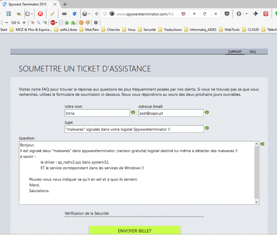4. Bonjour "le Crabe", bonjour à tous, Pouvez-vous répondre à cette question : Spywareterminator (gratuit) a t-il 2 "malwares" ? et si oui que peut-on faire efficacement ? (1) En effet le logiciel Adwcleaner signale après analyse deux "malwares" : un driver dans system32 nommé : sp_rsdrv2.sys et un service de windows associé! (1) après "élimination " réalisée par Adwcleaner, le fichier driver sp_rsdrv2.sys réapparaît systématiquement! Je n'ai pas touché au service! L'unique solution est-elle de désinstaller Spywareterminator?