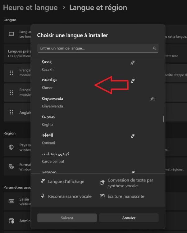 17. hello, pour votre langue, le KHmere, voici comment faire Sélectionnez Démarrer, puis Paramètres > Heure et langue > Langue et région. Dans la fenêtre Heure et langue > Langue et région, sous la section Langue, sélectionnez la langue d'affichage Windows souhaitée dans le menu déroulant peut être il faudra regarder si il y a pas un pack clavier ou un pack langue a télécharger avec cette langue. pour le pack office, pareil par exemple pour windows 11 mais c'est identique a W10, ici : cliquer sur l'encadré dans la barre de taches a droite en bas sur votre pc ensuite vous verrez ceci ou approchant et dans la liste on retrouve la langue attention en faisant la manipe, car si cela parle une langue que vous comprenez totalement pas sa peut être perturbant. Le clavier lui peut s'en trouver affecté aussi. attendez un autre avis pour les pack office etc ..