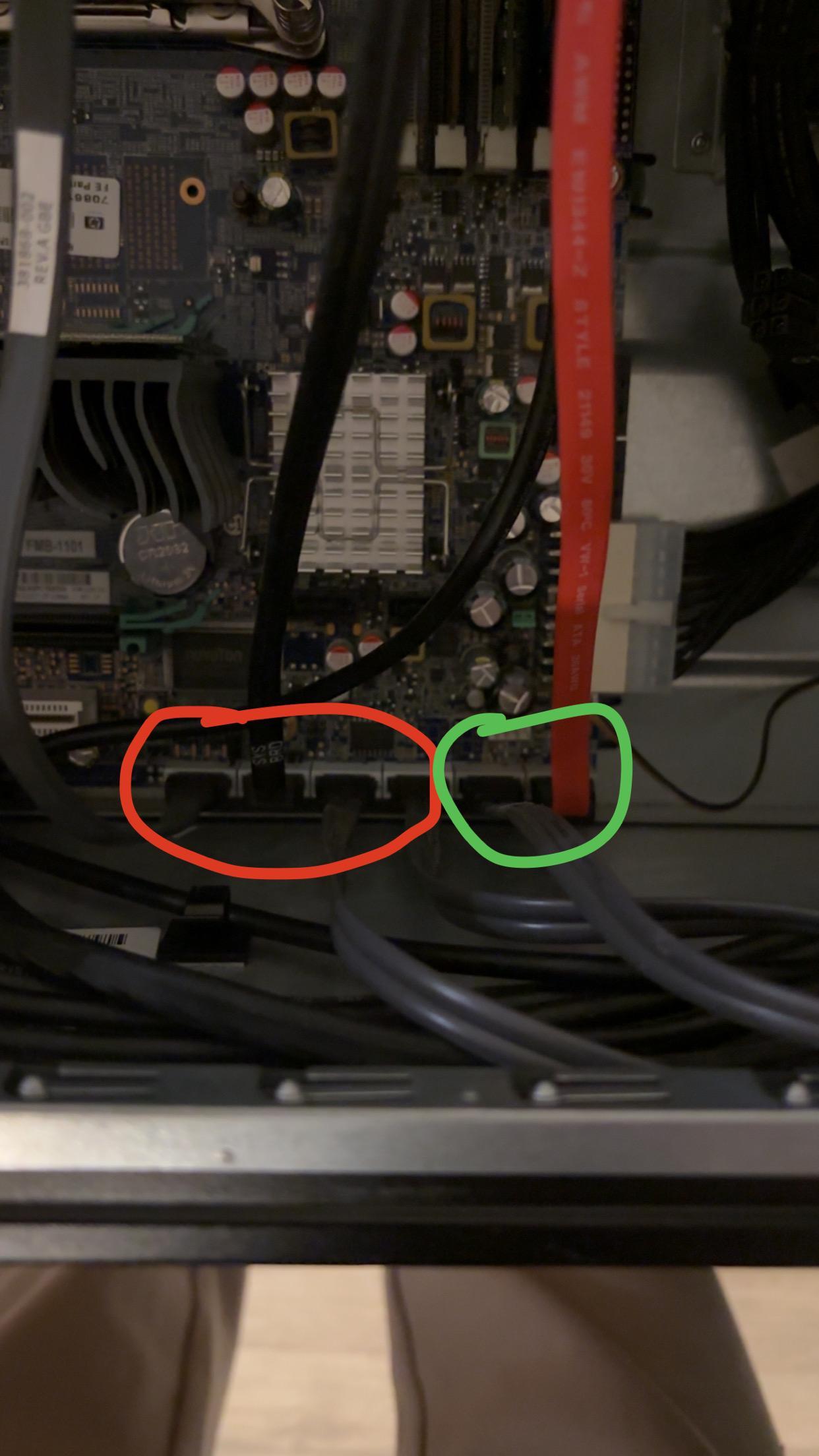 hello, sur ceux entourer en rouge, si vous ne mettez un HDD sur un des port Sata, est ce que cela fonctionne! visiblement il y a 4 Sata en panne qui sont entourer. Si vous mettez un HDD avec windows dessus, sur le premier port, il boot et cela fonctionne ? si oui, tester les 3 autres .. Si cela marche, mettez un HDD en plus sur les ports qui ne fonctionne sois disant pas. Si cela marche continuer avec un supplémentaire. Pourquoi je demande ça !!! Car peut être votre alimentation est trop faible pour encaisser 5 disques dur. Ce qui aurait pu etre le cas aussi, mais vous n'êtes pas dans cette configuration là, c'est quand un NVME est brancher sur sont port NVME, il désactive un ou deux port SATA mais vous ne semblez pas être dans ce cas de figure
