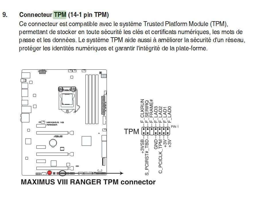 hello, cette affaire de TPM en effet il faut faire attention au brochage, on a des 20 pin ou des 14 pin etc. Il peut même y avoir des TPM a 14 broches mais les pin sont a des emplacements différent voici le schéma d'un TPM et les pin correspondant on vois sur le schéma +3v et encore une fois +3v sur un autre TPM 14 broches on pourrait constater que les deux +3V ne sont pas au même endroit et là patatra c'est plus compatible. donnez nous les images de votre module, recto verso la ou il y aurai des inscriptions, on vas tenter de retrouver un schéma voir si tout correspond bien a votre CM - Module de là si tout correspond, il faudra voir si c'est pas une option dans le bios ou un paramétrage a faire