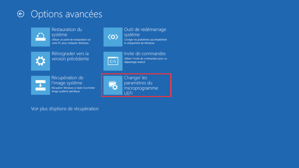 sur cette image, cliquer sur depannage ensuite sur options avancées ensuite Changer les paramètres du microprogramme UEFI